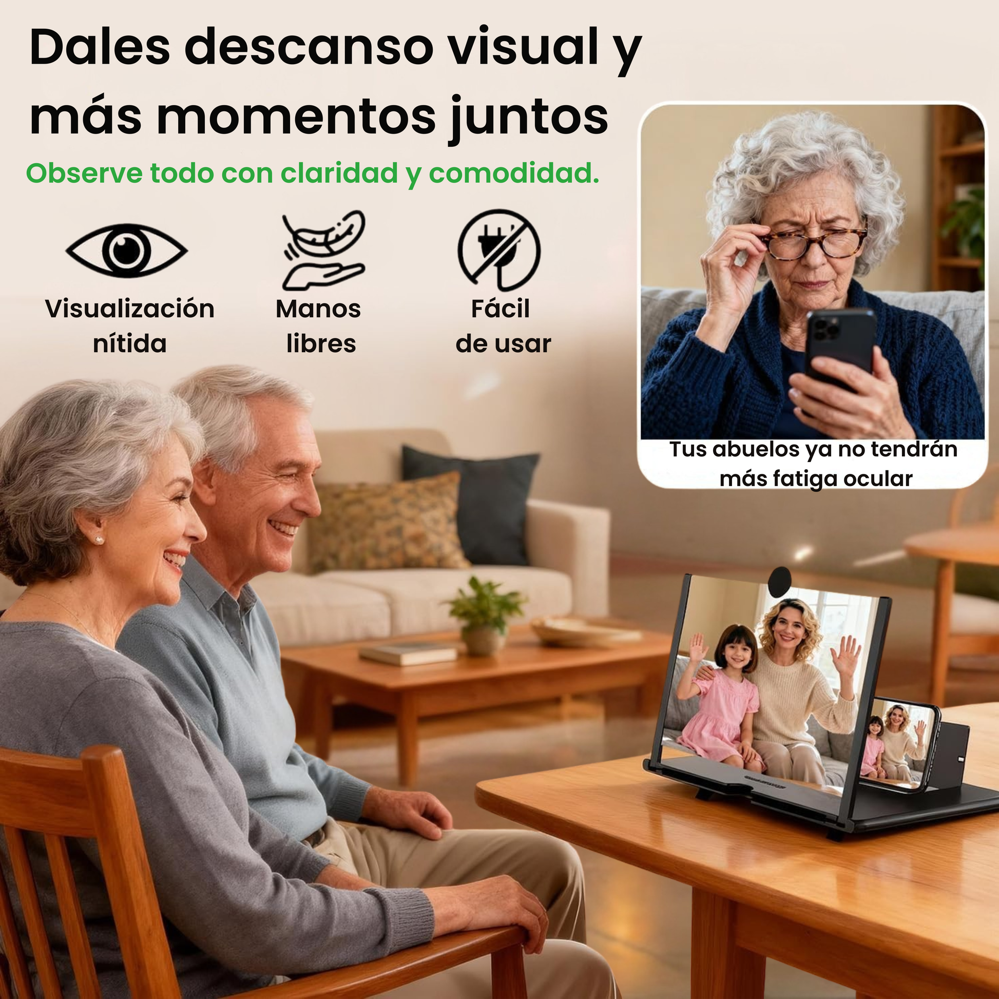 Tus abuelos como muchos otros se les dificulta ver bien, ahora si les regalas el producto podrán leer mensajes, ver fotos y disfrutar videos sin esforzar la vista, y volver a usar su móvil con comodidad. Porque la edad no debería impedir disfrutar de lo que más les gusta
